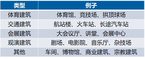 高大空间建筑在公用、民用建筑方面主要是有影剧院、音乐厅、大会堂、体育馆、展览馆等建筑。在工业建筑方面主要有工业车间厂房、船舶制造安装、航空航天测试组装等等。